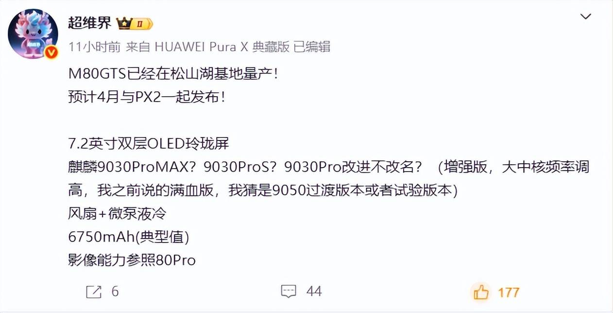 据博主“超维界”爆料,华为全新性能旗舰Mate 80 GTS已正式在松山湖基地启动量产,供应链正全力推进备货工作。该机预计于2026年4月与折叠屏新品PX2同步发布。