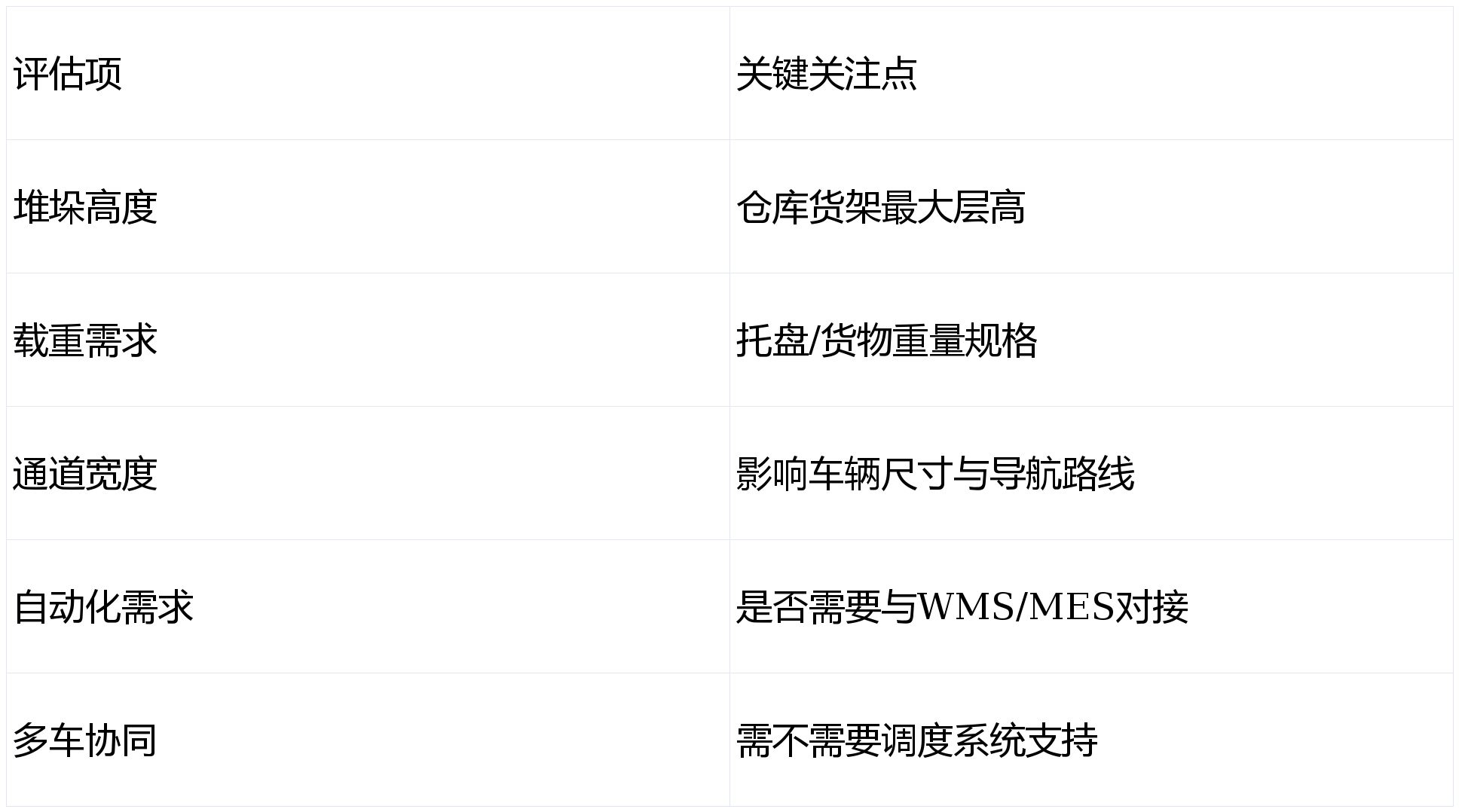 包括地面状况、通道尺寸、货架规格与搬运路线规划。