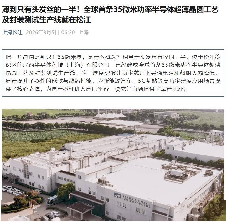 3 月 5 日消息,据上海松江官方今日消息,位于松江综保区的尼西『半导体』科技(上海)有限公司,已经建成全球首条 35 微米功率『半导体』超薄晶圆工艺及封装测试生产线。