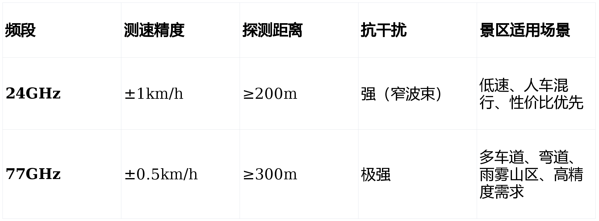 - 主干道 / 观光车道(多车道、车速 30–60km/h):选77GHz 高精度、多目标跟踪、雷视融合抓拍。