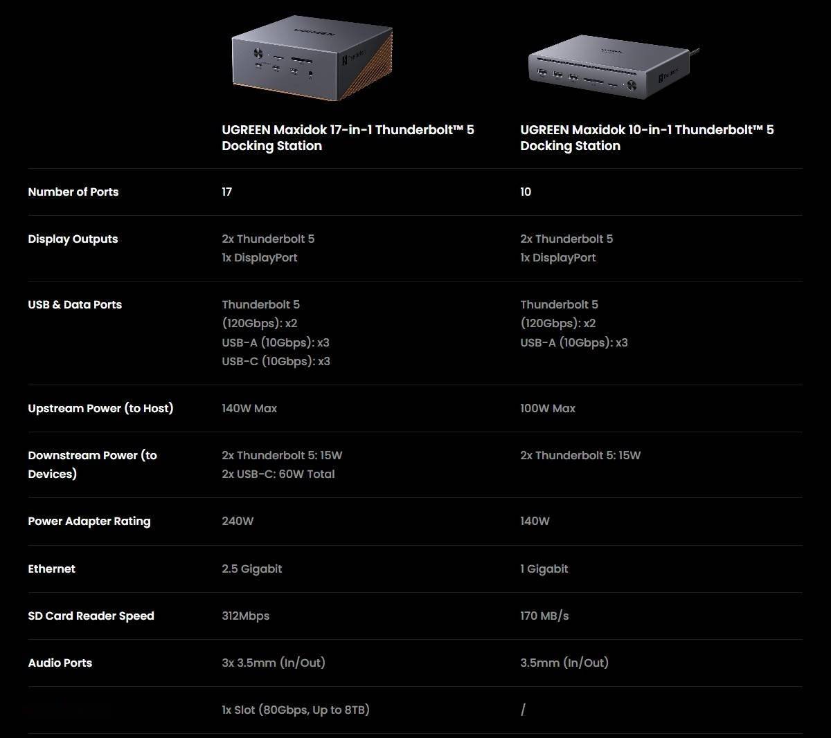 绿联 Maxidok 系列 17 合 1 雷电 5 扩展坞早鸟价 389.99 美元💵,10 合 1 型号早鸟价则是 249.99 美元💵(99小常识注:现汇率分别约合 2697 / 1729 元人民币)。