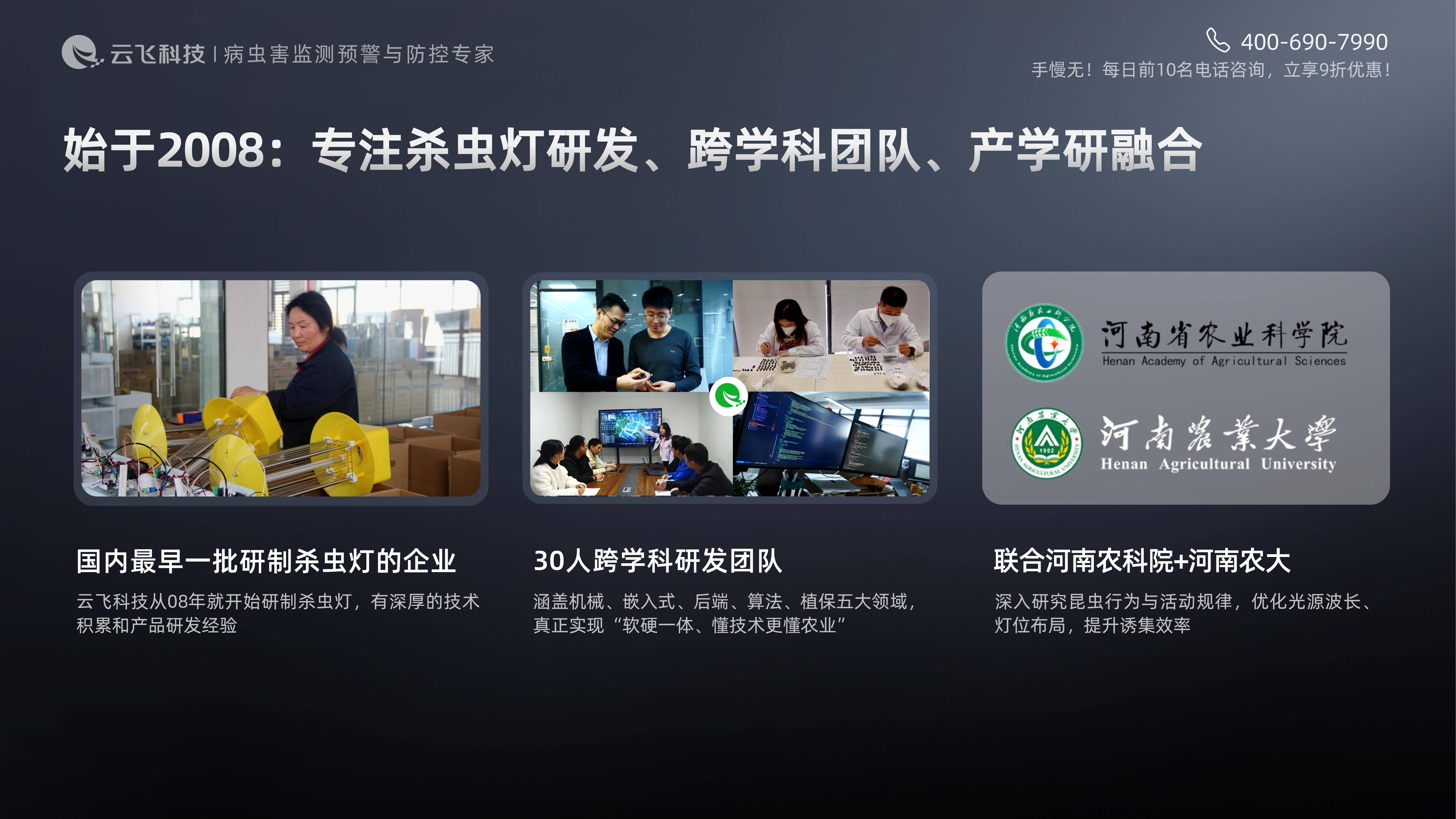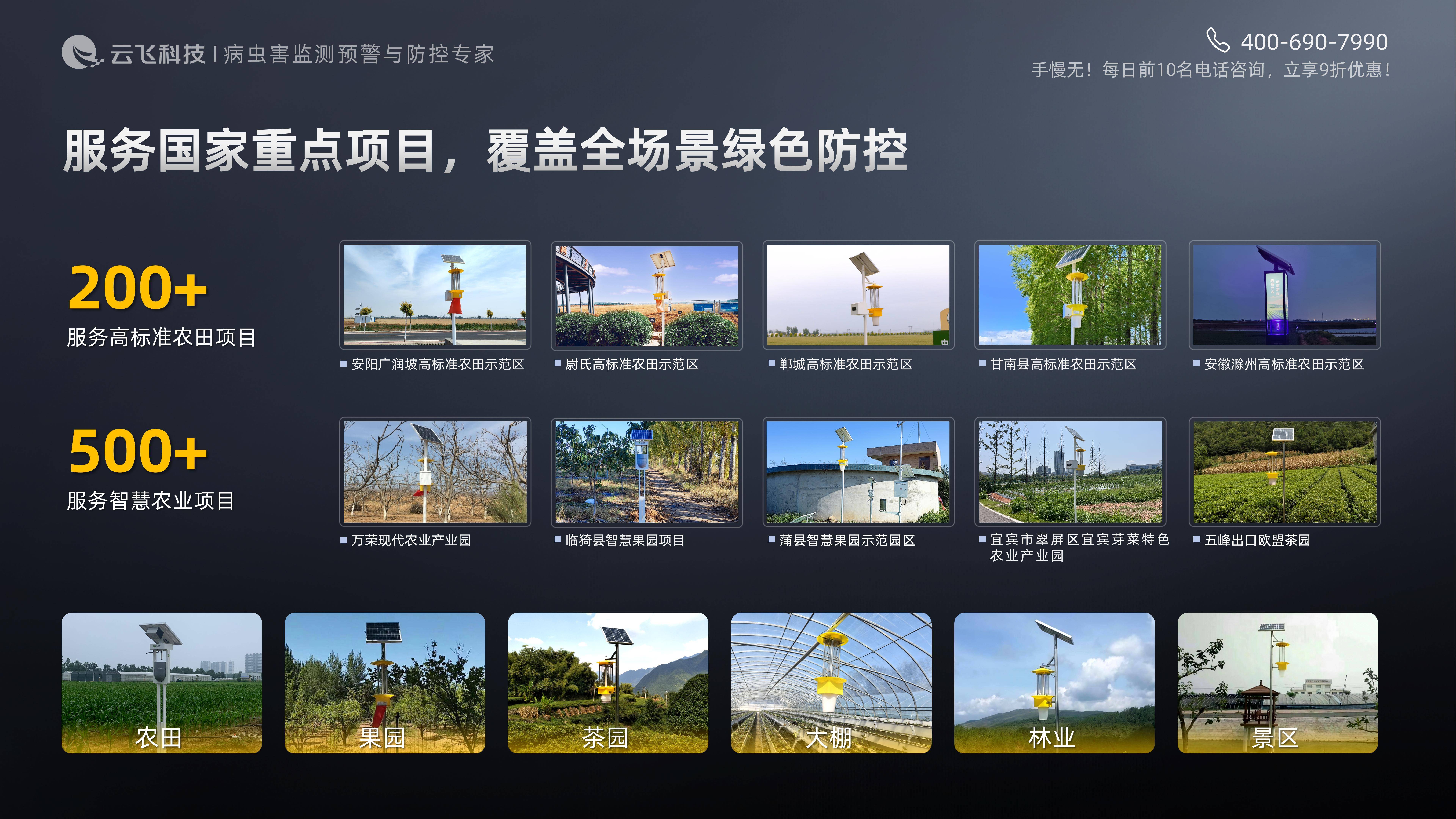 稳定的背后,是云飞18年技术积淀与实力的支撑。作为国内最早一批研制杀虫灯的企业,云飞拥有30人跨学科研发团队,联合河南农科院、河南农大深耕昆虫行为研究,优化光源与灯位布局;6000㎡自有工厂执行5S管理,年产能9万台,品质与成本双可控;更服务过北大荒集团、中国移动等200+高标准农田与500+智慧农业项目,经行业龙头严苛考验。