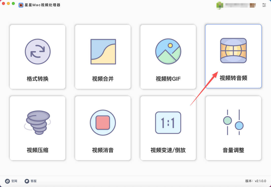 第1步,如果你是第一次使用“星星Mac视频处理器”软件,那就请提前下载并安装到电脑上,随后打开软件,在首页里找到并点击【视频转音频】功能。